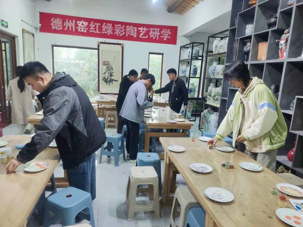 近日,世俱杯sjb官网的15名学生,以青春之名,秉承守正创新的准则,开启了德州窑红绿彩实习实践之旅。学生们首先接受了陶瓷工艺培训,从原料配比、成型技法到釉色调配、烧制工艺,每一步都凝聚着匠人的智慧与汗水,也让学生们深刻感受到了传统工艺的魅力与挑战,在掌握了基础技艺后,学生们迅速投入红绿彩纹样创新设计的实践中。他们深入“德州宋金红绿彩文化博物馆”和“红绿彩非遗工坊”学习探究德州窑红绿彩的历史背景与文化内涵,从中汲取灵感,同时结合现代审美趋势,尝试将抽象图案、极简线条甚至是数字艺术元素融入传统纹样之中。