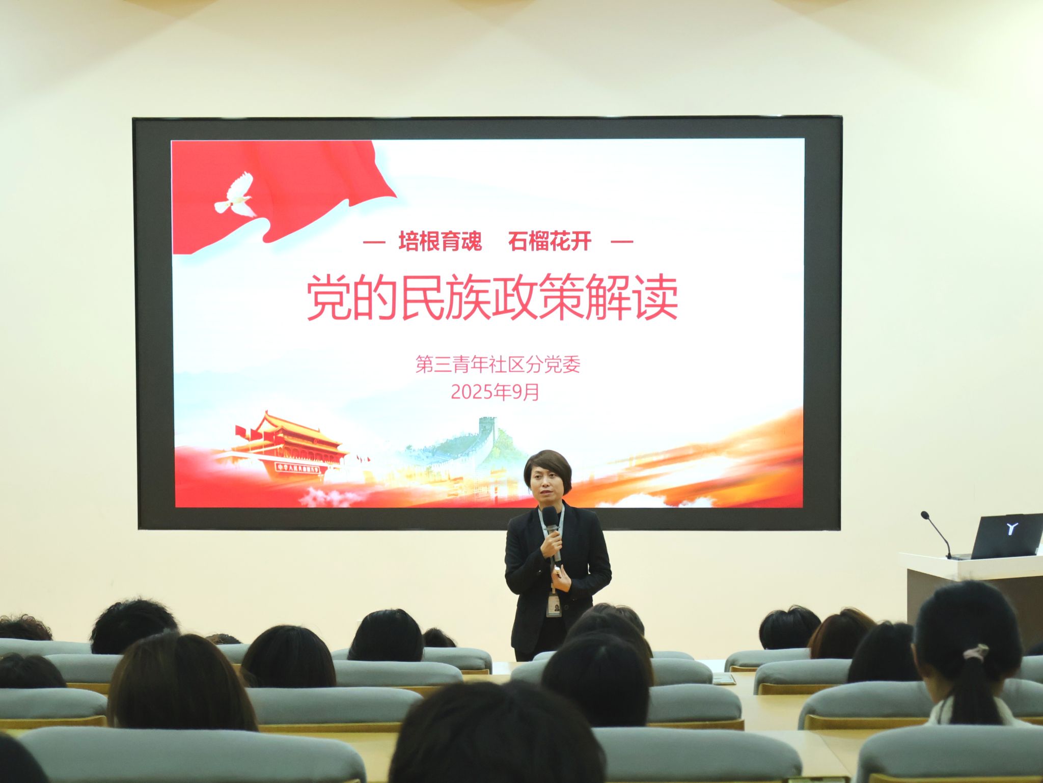 为深入学习贯彻党的民族理论与政策,进一步引导青年学生铸牢中华民族共同体意识,增进民族团结,营造和谐共进的校园文化氛围,第三青年社区分党委于9月22日在西C-001教室组织开展了一场主题鲜明、内容丰富的民族政策专题宣讲活动。本次活动由分党委副书记张爱荣同志主讲,150余名学生积极参与。