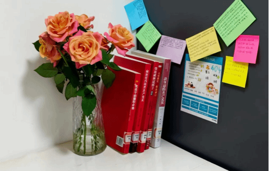 为了让红色精神常伴身边,读书会的最后一项活动,是共同布置宿舍“红色角”。大家分工明确、有序配合,一起为这个红色小角落贡献着自己的力量:有的将书写好的感悟笔记用夹子串起,挂成别致的“感悟帘”;有的将红色书籍分类摆放进简易书架,还细心地在每本书上贴了手写推荐语;还有的用一束玫瑰花进行点缀,让这个小小的角落瞬间充满了浓厚的红色氛围。