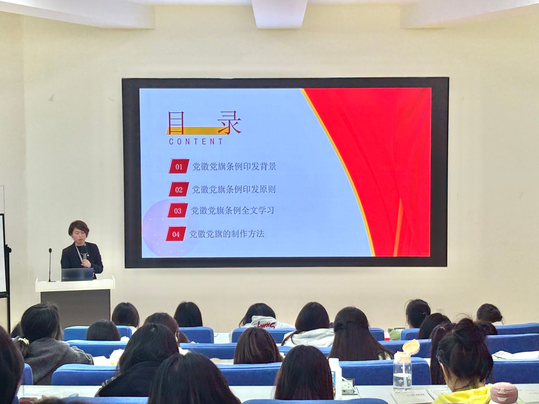 本次党课中,张老师还对《中国共产党党徽党旗条例》进行了系统学习。张老师详细讲解了党徽党旗的图案、规格、材质等核心要素,明确了使用场景、使用规范以及禁止行为。使学员们清晰地掌握了何时何地可以使用党徽党旗、以及如何正确使用党徽党旗。