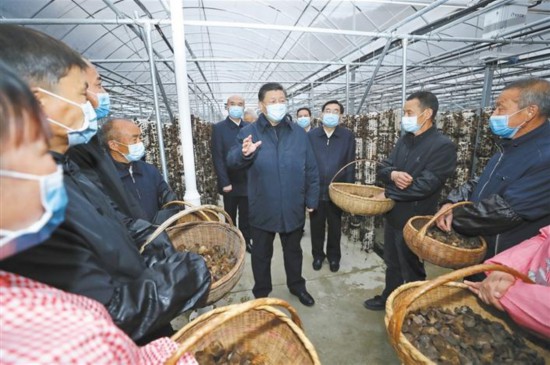 4月20日至23日,中共中央总书记、国家主席、中央军委主席习近平在陕西考察。这是4月20日,习近平在商洛市柞水县小岭镇金米村智能联栋木耳大棚,同村民亲切交流。(新华社记者 鞠鹏摄)