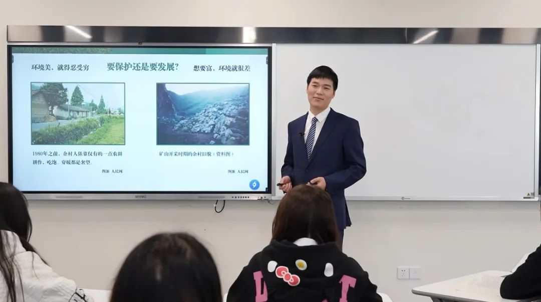在项清喜的眼中,教育是需要兼具温度与力度的。正如他参与这项大赛时,一如既往地保持自己的教学风格。他借助真实的案例对深刻的理论精深解读,引证浙江省安吉县余村的发展历经一波三折、村民勇闯难关的事例,以权威数据做对比、用官方视频来注解,以小村庄的天翻地覆变化说明中国大地的日新月异,落脚于阐述由“两山”理念丰富发展形成的习近平生态文明思想的引领作用。