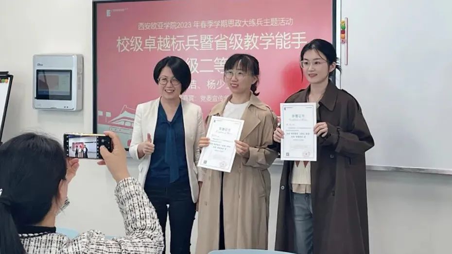 在来到欧亚的三年中,她不断提升自我工作能力,在学院领导与同事的鼓励和帮助之下,2022年便参与了陕西省高校思政课程课程思政教师“大练兵”这项规格较高,权威性与专业性十足的省级比赛,大赛一年仅举行一次,杨洁在2022年与2023年分别获得了“教学能手”的奖项。这对于一名入职不久的思政教师而言,这不仅是她教师生涯中的第一份荣誉,更是对自我专业能力的充分认可和肯定。