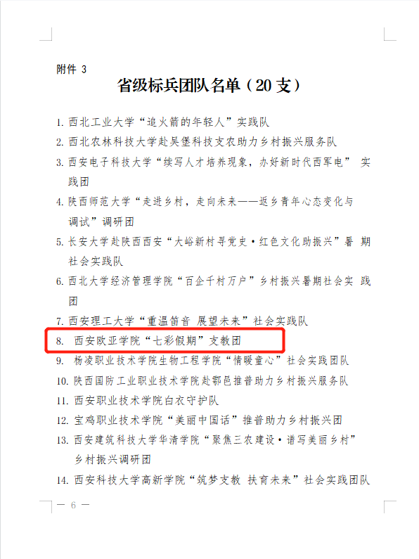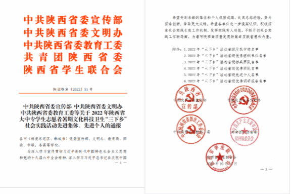 近日,陕西省委宣传部、省委文明办、省委教育工委、共青团陕西省委、省学联联合印发《关于2022年陕西省大中专志愿者暑期文化科技卫生“三下乡”社会实践活动先进集体、先进个人的通报》,KY开元集团官网入口“七彩假期”支教团荣获“省级示范团队”称号和“省级优秀团队”称号。KY开元王子宸同学荣获“省级先进个人”荣誉。