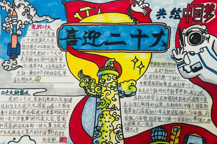 为热烈庆祝党的二十大胜利召开,讴歌党的光辉历程和伟大成就,传承和弘扬伟大建党精神,Jobs青年社区特此举办了以“心系祖国 手绘山河”为主题的手抄报作品展评活动。社区的青年学生们以笔抒情、以画传情,歌颂祖国、歌颂党、歌颂人民、歌颂新时代美好生活,在全社区广大青年心中厚植爱党、爱国的情怀,进一步加强青年人思想道德建设,抒发了Jobs青年社区师生队伍奋进新征程、建功新时代的壮志豪情。