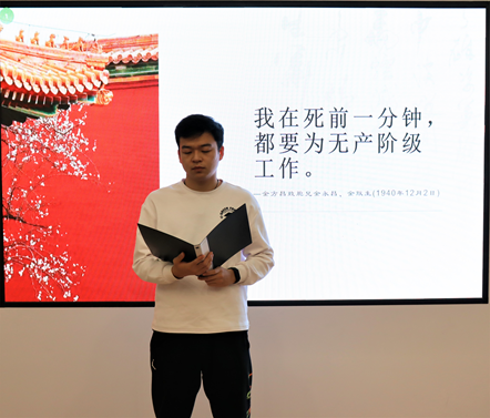 张鑫同学朗诵的是《我在死前一分钟都要为无产阶级工作》,这是抗日烈士金方昌同志于1940年12月2日在狱中致胞兄金永昌、金默生所写的一封家书。金方昌同志在敌人的监牢里遭受了非人的折磨,自知来日无多,于是给两位哥哥写了这封家书,12月3日金方昌同志牺牲,年仅20岁。他在信中告诉哥哥自己被捕的经过,以及虽遭酷刑但没有屈服,仍坚守党的秘密和信仰的情况,并且恳请哥哥能够继续进行无产阶级的革命事业,坚持到革命胜利的那一天,同时也要把弟弟、侄子们培养成无产阶级的革命战士。
