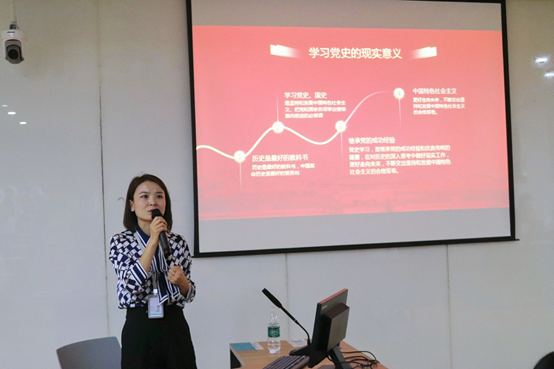 随后,李嘉瑜同志通过讲述学习党史的四个意义,向同学们深刻揭示了党的百年辉煌带来的启示,在建设中国特色社会主义中,并非一帆风顺,而是需要青年们跟随着时代的步伐坚持三个原则、坚定不移地推进改革开放、坚定不移地走中国特色社会主义道路、不动摇、不懈怠,就一定能够胜利实现党所确定宏伟蓝图和奋斗目标。作为当代大学生,这也要求同学们需要讲政治、有信念,讲规矩、有纪律,讲品德、有品行,讲奉献、有作为,成为一名有担当的新青年,并坚持从思想、认知、行为三个方面去践行新时代精神。