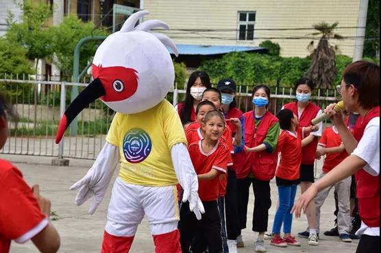 志愿者们和十四运吉祥物带领小朋友们开展趣味运动会,包括萝卜蹲、爱的抱抱等项目。