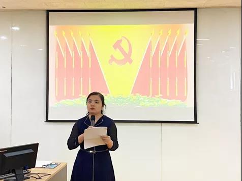 图二:尹渭莉同志代表上届分党委作题为《不忘初心、牢记使命,为建设一流的基层党组织而努力奋斗》的工作报告
