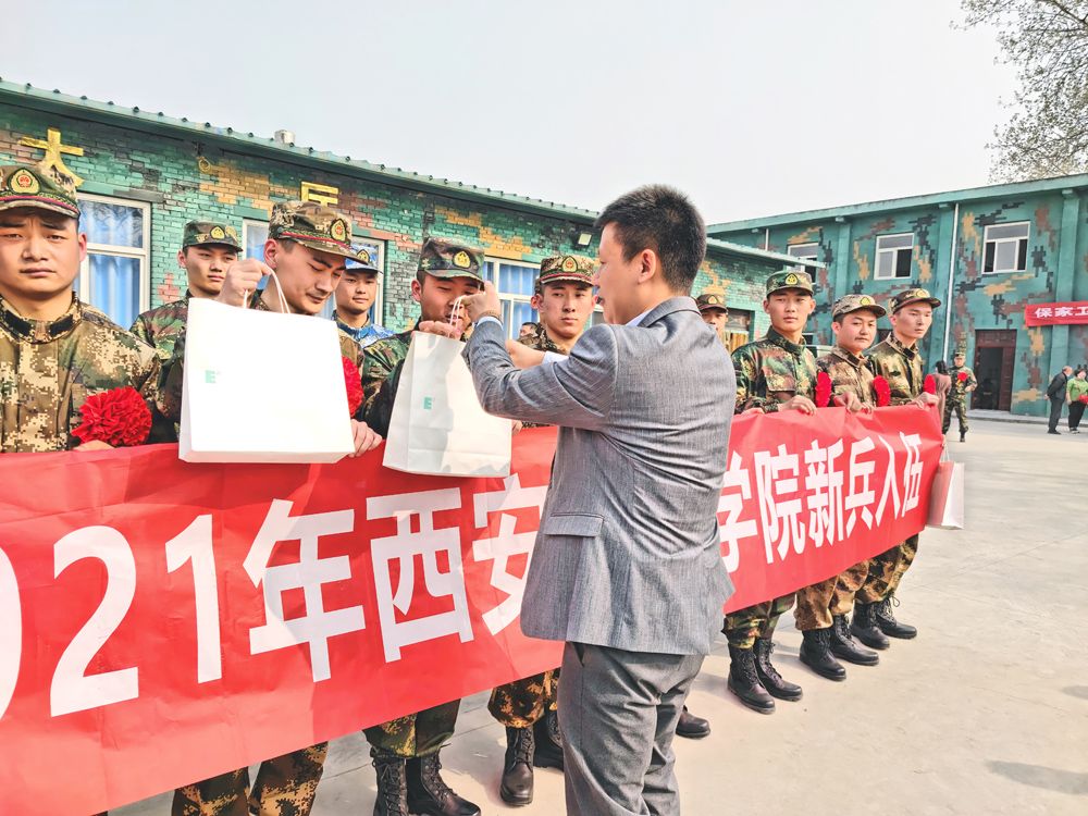 新兵们纷纷上前与学校领导亲切握手,言语间流露着内心深处的喜悦之情。学生发展处副处长董杨做了讲话,首先,向即将踏上光荣征程的新一代娇子表示热烈祝贺!役前训练是苦的、累的,但是再次看到你们熟悉的背影与面孔,身披戎装,个个神采奕奕、精神抖擞,你们就是训练场里那颗最耀眼的星!希望大家将陆续前往部队服役,担负起保家卫国的神圣职责。随后雁塔区人武部常海波政委和学校领导为同学们发放纪念品。