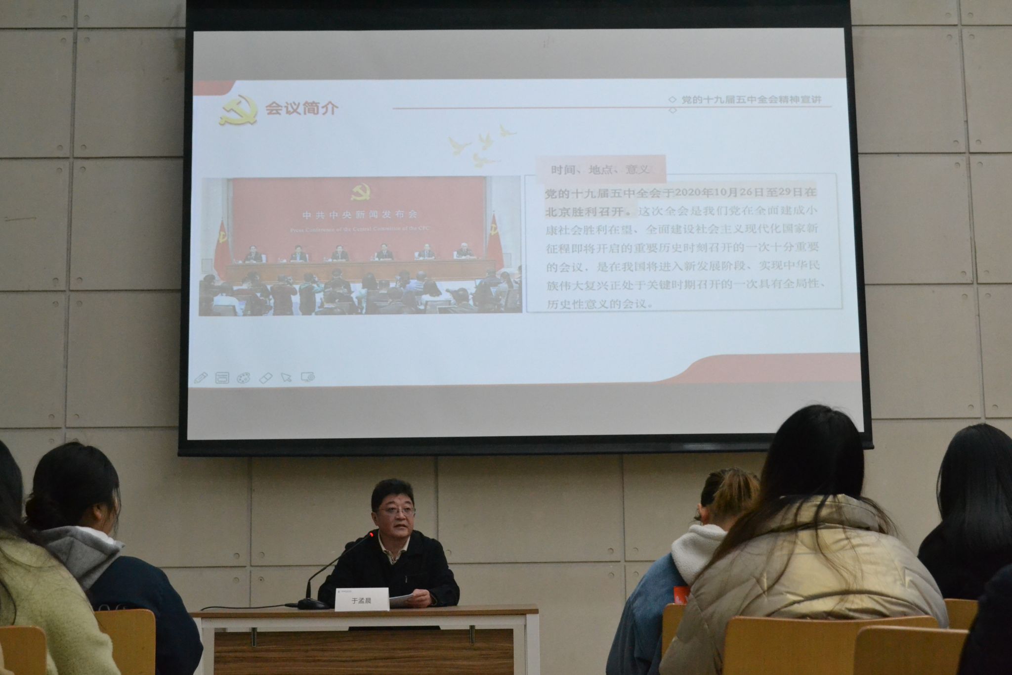 2020年12月22日中午12:45,KY开元党委书记于孟晨教授以 “党的十九届五中全会精神”为主题,向第九期大学生骨干培训班学员进行宣讲。