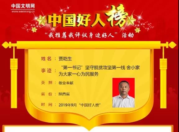 贾乾生是陕西省铜川市耀州区气象局副局长、照金镇杨山村第一书记、脱贫攻坚驻村工作队队长。他舍小家、顾大家,三位亲人先后重病无暇顾及,始终坚守脱贫攻坚第一线,为杨山村脱贫攻坚作出了突出贡献。