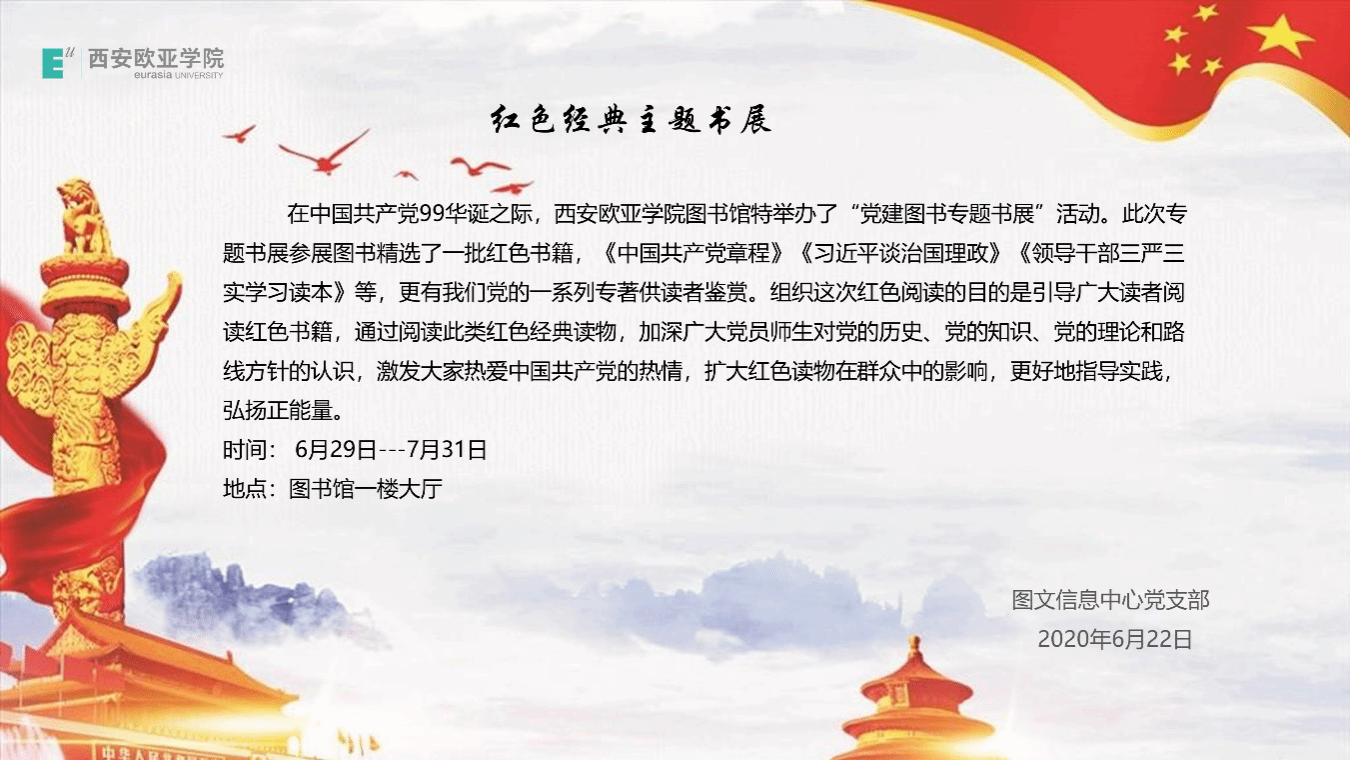 学校党委还在“党群之家”网站和“欧亚党建”微信公众号发布《致全体师生党员的一封慰问信》,向辛勤工作在各岗位上的共产党员表示亲切的问候和节日的祝贺,并号召全体师生党员从提高政治站位、强化责任担当、强化示范引领、全面从严治党、推进改革发展五个方面凝心聚力笃行,为推进新时代学校改革发展贡献力量。