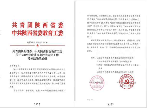 近日,共青团陕西省委、中共陕西省委教育工委联合下发了《关于2019年度陕西高校共青团工作考核结果的通报》(陕团联发〔2020〕10号),KY开元团委获得“陕西高校共青团大学生社会实践与志愿服务工作先进单位”,校长刘瑾教授荣获“2019年陕西高校支持共青团工作好校长”称号。