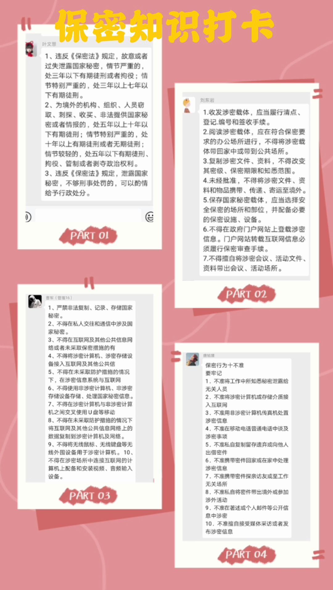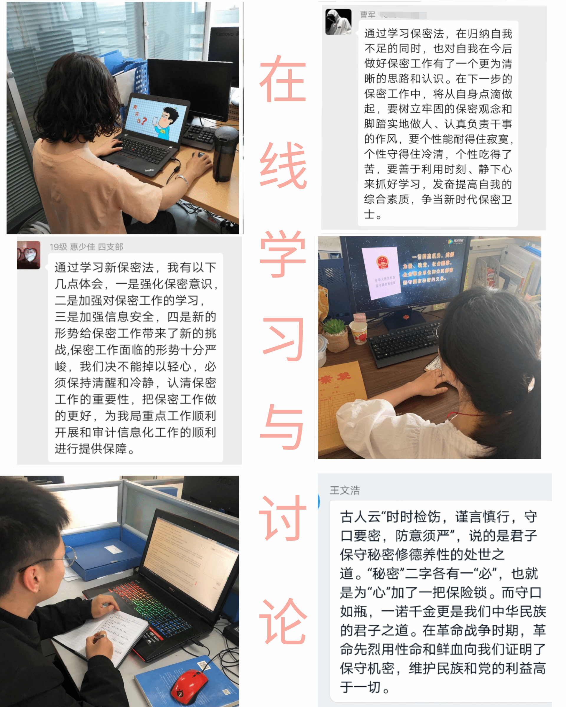 观看视频分享保密知识打卡活动、各支部线上座谈会热烈云讨论、在线保密知识考试等方式让社区师生对国家保密法有一个全面的认识,进一步增强了保密法制观念。