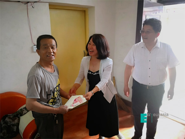(图一)校党委书记给学生家长送上慰问金