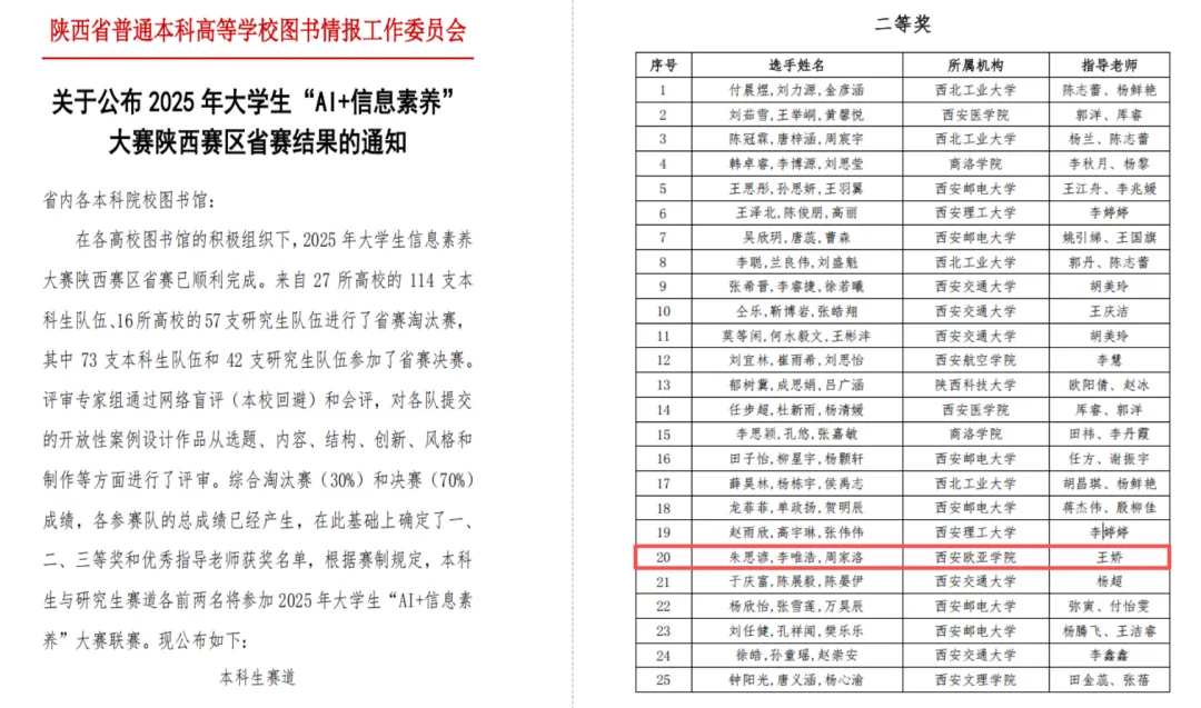 在学生竞赛领域,2025 年大学生“AI + 信息素养”大赛陕西赛区省赛传来佳讯。由图文信息中心王娇老师悉心指导,朱思谚、李唯浩、周家洛三位同学组成的团队,凭借深厚的专业功底、出色的实践能力与创新思维一路过关斩将,成功夺得本科组二等奖。值得一提的是,KY开元是本次赛事中唯一获此殊荣的民办高校,这一成绩不仅是对参赛师生辛勤付出的高度肯定,更印证了学校在“AI + 信息素养”人才培养领域的卓越成效。