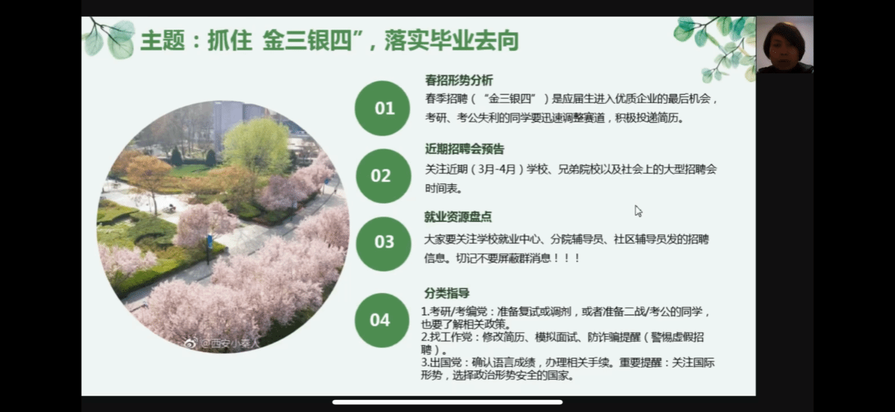 针对即将毕业的大四同学,班会重点围绕“毕业通关全指南”展开,梳理了本学期三大核心任务与时间节点。毕业任务清单:逐一核对毕业论文(设计)、答辩安排、学分修读等关键事项的时间节点,厘清优先级,避免错过重要事项;春招与就业指导:解读春季招聘会安排、简历修改、面试技巧等就业支持服务,动员同学们主动出击,把握春招黄金期,主动对接心仪岗位,实现顺利就业;毕业生事务提醒:明确毕业班离校手续、档案转接、党员组织关系转移等事务的办理要求与流程,确保同学们平稳有序毕业。