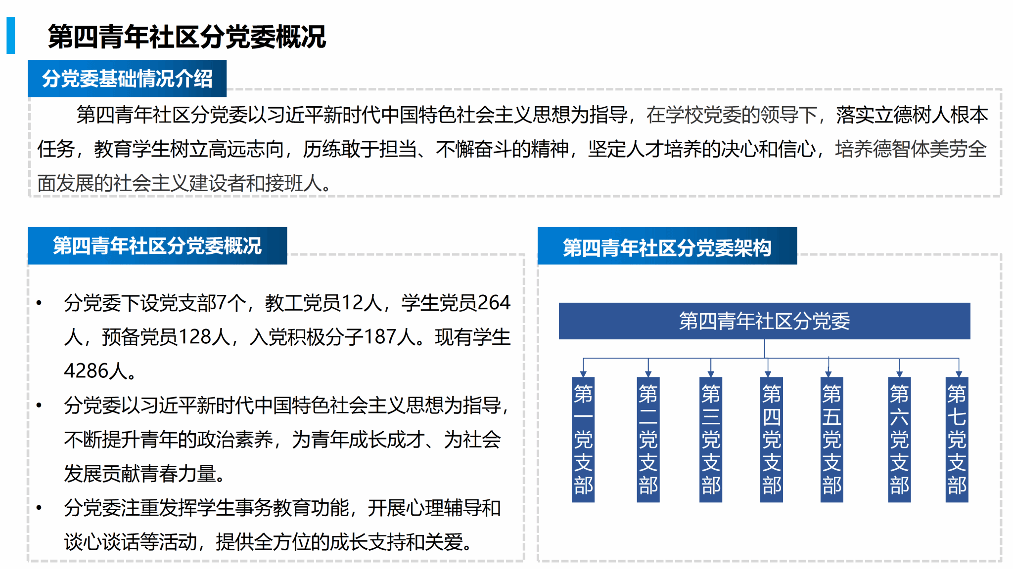 第四青年社区分党委以习近平新时代中国特色社会主义思想为指导,在学校党委的领导下,落实立德树人根本任务,教育学生树立高远志向,历练敢于担当、不懈奋斗的精神,坚定人才培养的决心和信心,培养德智体美劳全面发展的社会主义建设者和接班人。