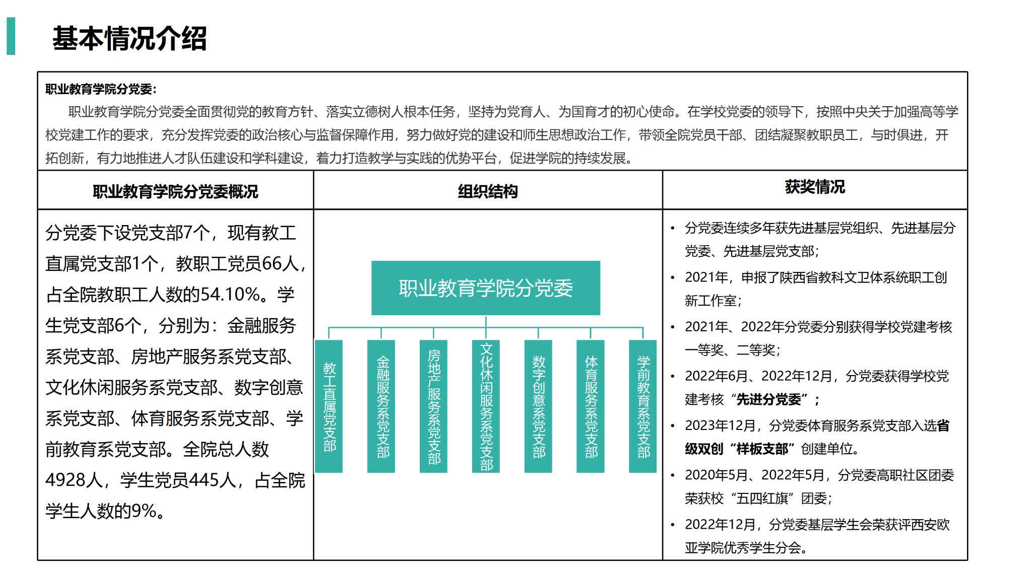 职业教育学院分党委全面贯彻党的教育方针、落实立德树人根本任务,坚持为党育人、为国育才的初心使命。在学校党委的领导下,按照中央关于加强高等学校党建工作的要求,充分发挥党委的政治核心与监督保障作用,努力做好党的建设和师生思想政治工作,带领全院党员干部、团结凝聚教职员工,与时俱进,开拓创新,有力地推进人才队伍建设和学科建设,着力打造教学与实践的优势平台,促进学院的持续发展。