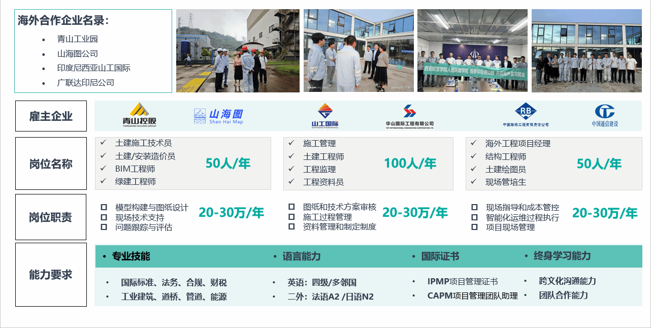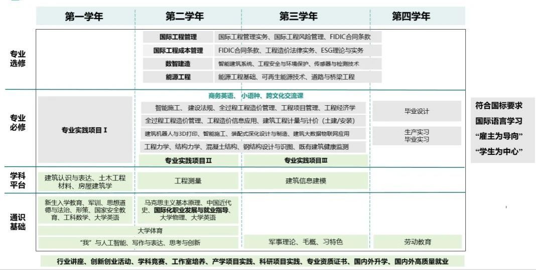 1. 在专业能力方面,我们采用创新的"微专业+模块化课程"培养模式。例如针对东南亚基建类项目需求,特别开设电力工程等短期强化课程,帮助学生快速掌握行业核心技能,灵活的课程设置有效弥合了学校教育与职场需求之间的差距。