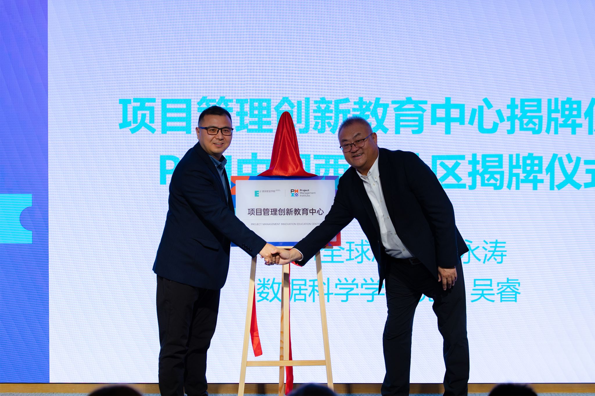 PMI全球副总裁陈永涛与KY开元集团官网入口数据科学学院执行院长吴睿为项目管理创新教育中心揭牌