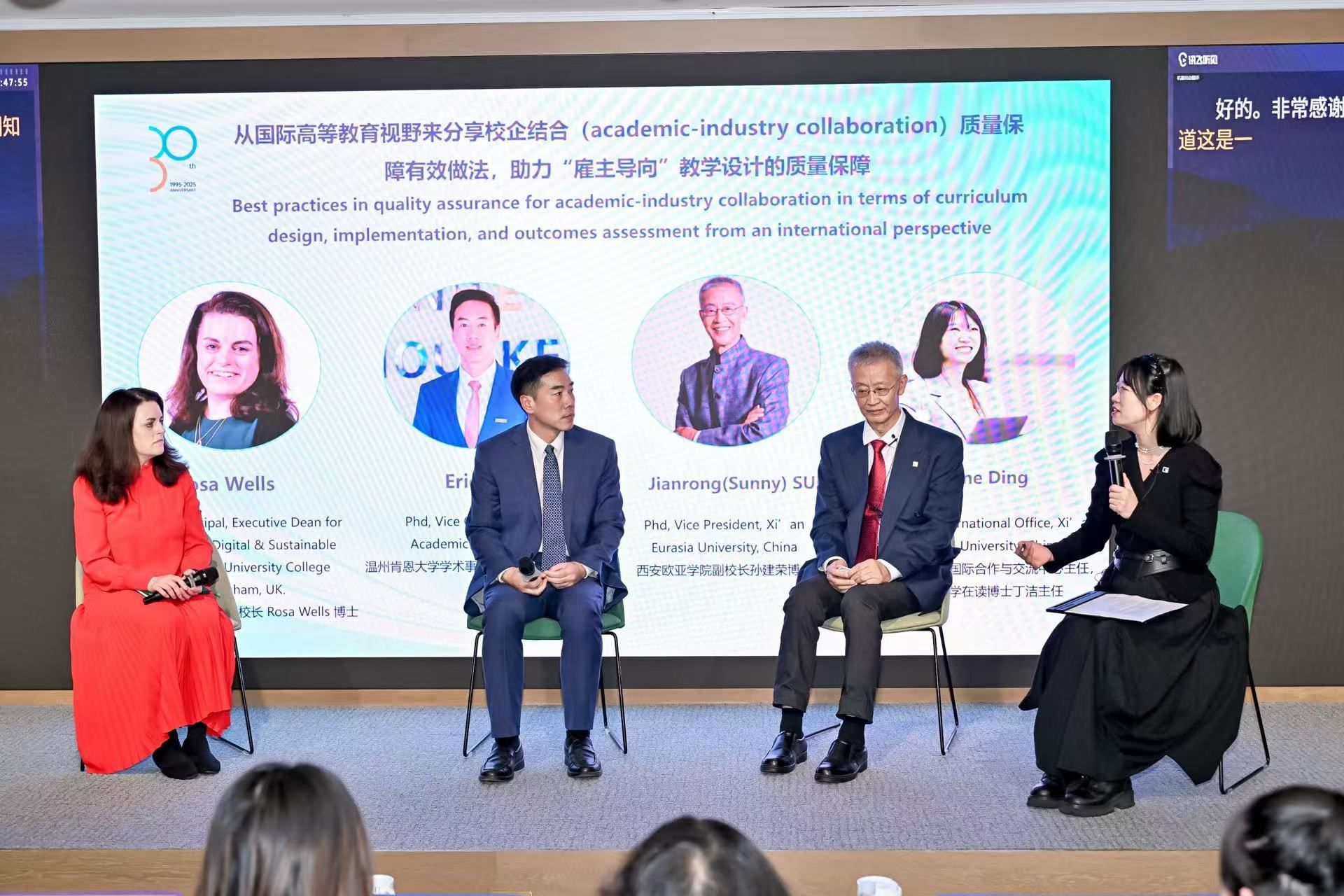 校庆当日,教学质量评估中心、国际合作与交流中心与国际语言中心在春山里木礼堂联合举办“企业导向与人才培养——高等教育国际化视野中的质量保障”圆桌论坛。论坛邀请英国伯明翰大学学院副校长罗莎・韦尔斯、温州肯恩大学副校长杨毅欣、KY开元集团官网入口副校长孙建荣参与分享,围绕英、美高校课程设计与社会需求对接、教育质量保障路径及微专业认证标准等议题展开交流,为KY开元人才培养模式创新与质量保障体系建设提供了国际经验与实践思路。