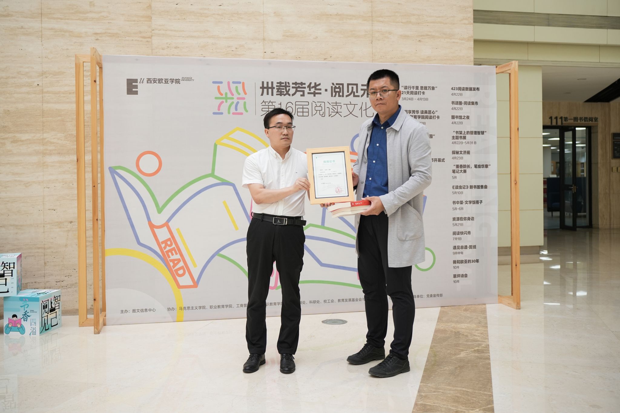 4月22日欧亚阅读文化节开幕式上,辛峰(左)分享新书并向图书馆捐赠3册书。