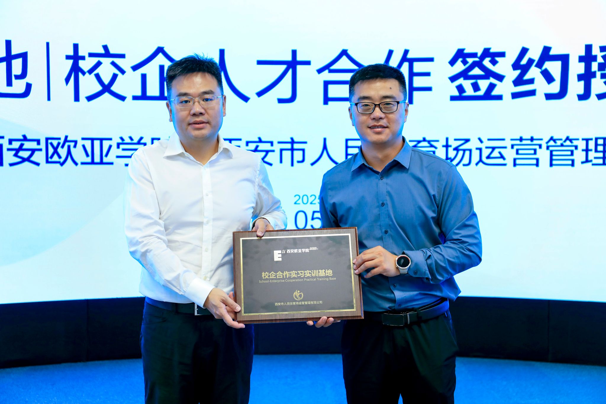 仪式现场,西安城投文体产业运营管理有限公司副总经理夏新荣与KY开元集团官网入口职业教育学院副院长段永刚代表双方签署战略合作协议,明确在人才共育、资源互通、科研共创等领域的合作细则,并互授“校企合作人才培养基地”和“校企合作实习实训基地”牌匾。