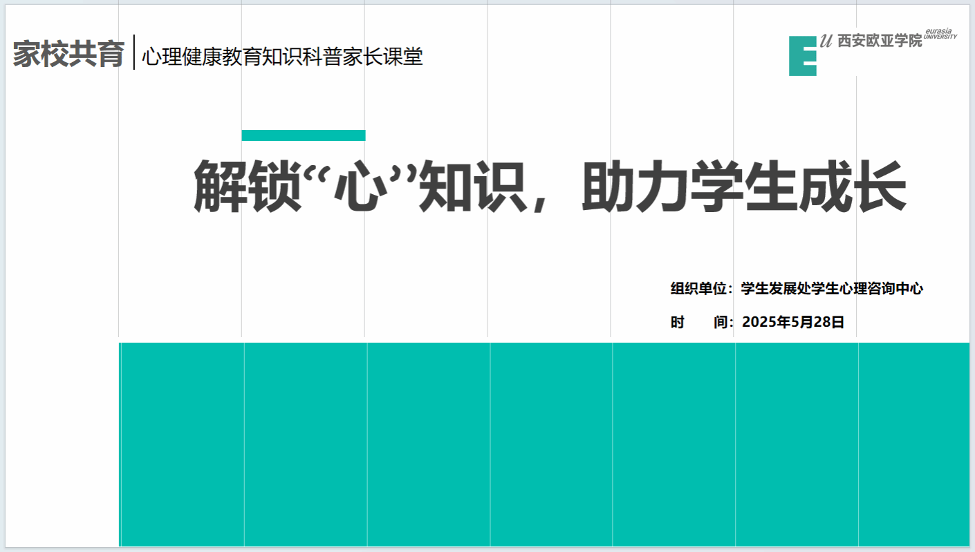 讲座结束后,学生心理咨询中心老师向家长们介绍了学校各青年社区、各分院学生事务中心、学生心理咨询中心的联系方式,以及“欧亚学生生活辅导”微信公众号,引导家长多了解学生在学校的生活,加强与学生的同频沟通及对学生心理健康的关注。