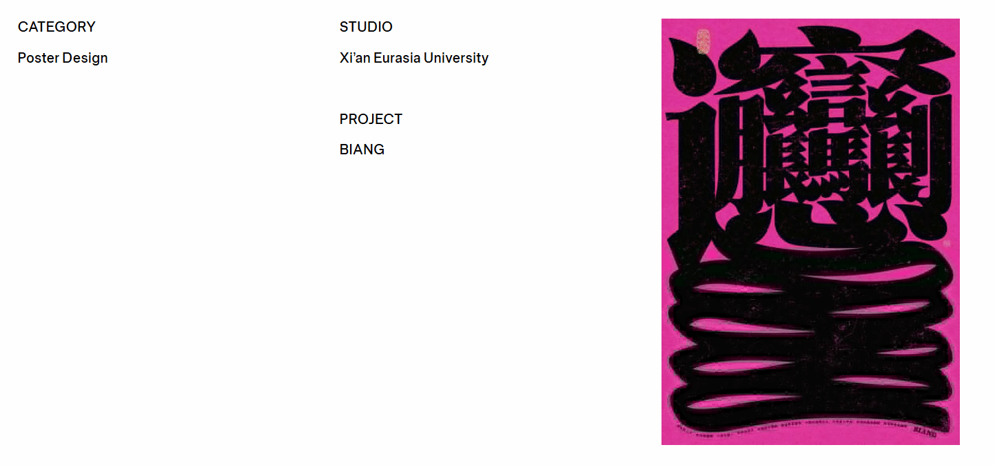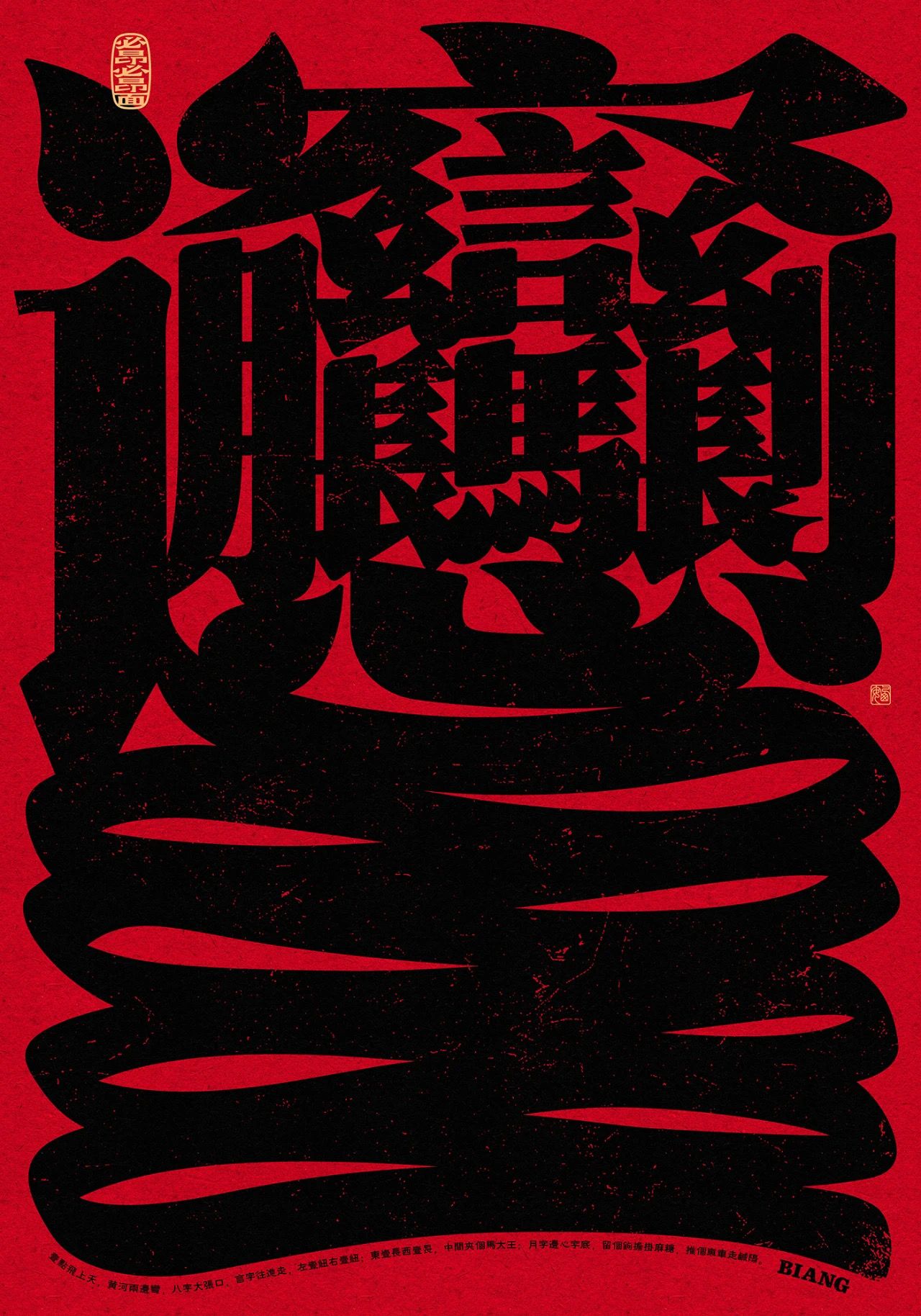BIANG》结合印刷体与毛笔字的共同构造,将汉字“biang”置于满屏空间内,以冷暖对比鲜明的七种纯色色彩赋予情绪以及意义。在黄放的构思里,《biang》,是千年古都西安的在地文化转变为具备全球属性的阐释符号的一次尝试。