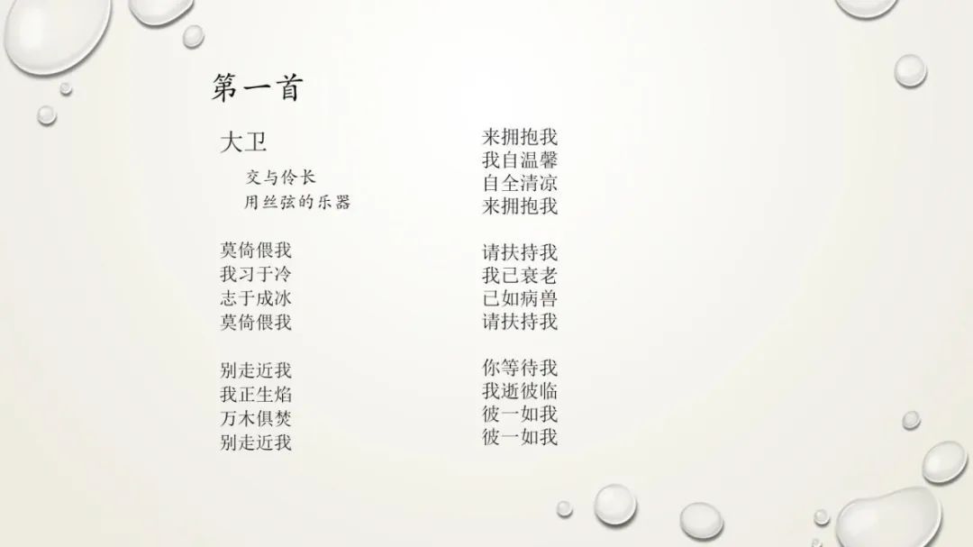 《大卫》这首诗的妙趣,在于“既是《诗经》,又是《圣经》”的奇妙互文。童明指出,诗中“大卫”是《圣经-诗篇》的叙述者;副标题借用了《诗篇》的格式,而“丝弦乐器”带有中国民乐元素。这样,既保留了大卫对神倾诉的口吻(如《诗篇》中“我的上帝,为何遗弃我”的抱怨与依赖),又注入了东方文化中含蓄的情感表达(如“我自温馨,自全清凉”等),两种文明在同一首诗里共存,相映成辉。