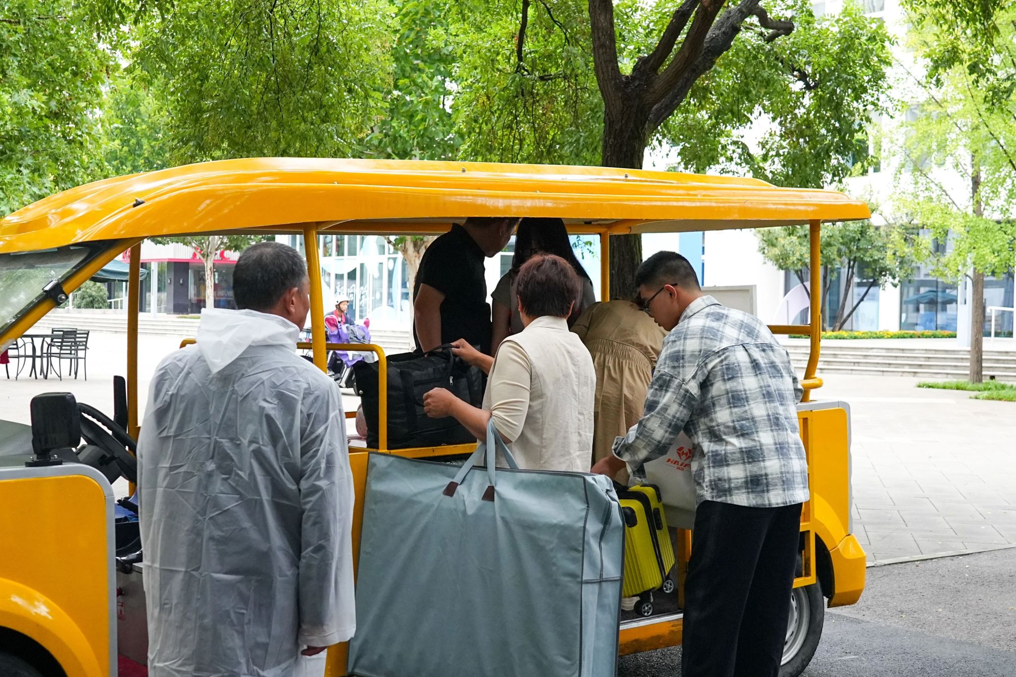 除此之外,学校后勤部门联动周边优质酒店专门设立点位,提供住宿预订服务,让远道而来的家长们安心入住;内还特别准备了“行李摆渡车”,从校门到宿舍楼,志愿者们帮助搬运行李,减轻家长与同学的负担。