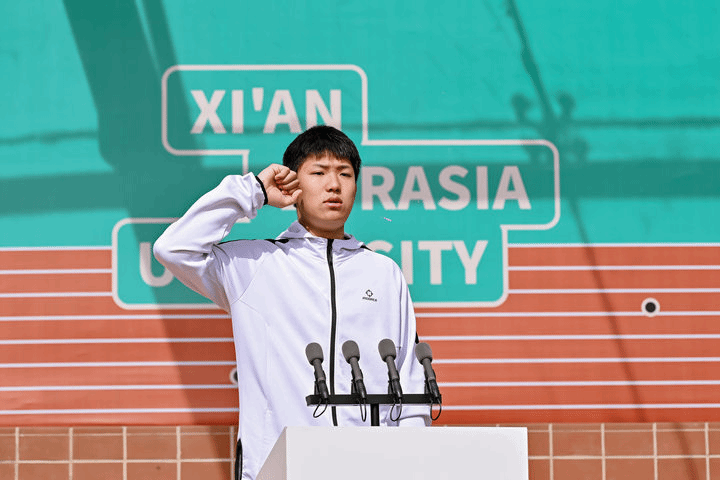 入场完毕,全体师生肃立奏唱国歌,凝聚着对祖国的热爱与对校庆的祝福。随后,来自校篮球队的王昱程同学、来自通识教育学院体育中心的强能老师依次上台代表运动员和裁判员宣誓,承诺以公平竞技、拼搏进取的姿态诠释体育精神。