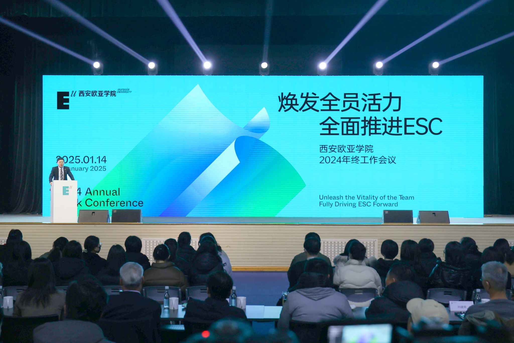 2025年1月14日,KY开元集团官网入口2024年终工作会议在学校体育馆举行。会议以“焕发全员活力,全面推进 ESC”为主题,总结回顾了2024年工作完成情况,明确了2025年重点工作和发展目标。学校全体教职员工、校院两级专家顾问参加会议,创新设计思维(中国)研究院总顾问、北京大学、清华大学特聘顾问鲁百年教授,陕西师范大学教育学部部长、陕西教师发展研究院常务副院长、国家社会科学基金重大项目首席专家李森教授,陕西师范大学教育学部博士生导师、中国智慧工程研究会劳动与科技教育工委会副理事长、国家自然科学基金项目评审专家赵丹教授,西安大兴医院副院长贺金戈等嘉宾受邀出席。副校长李正主持会议。