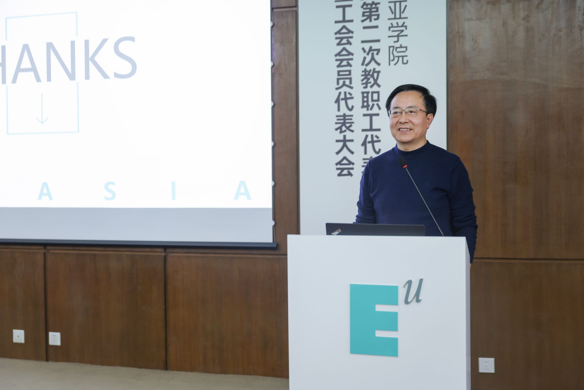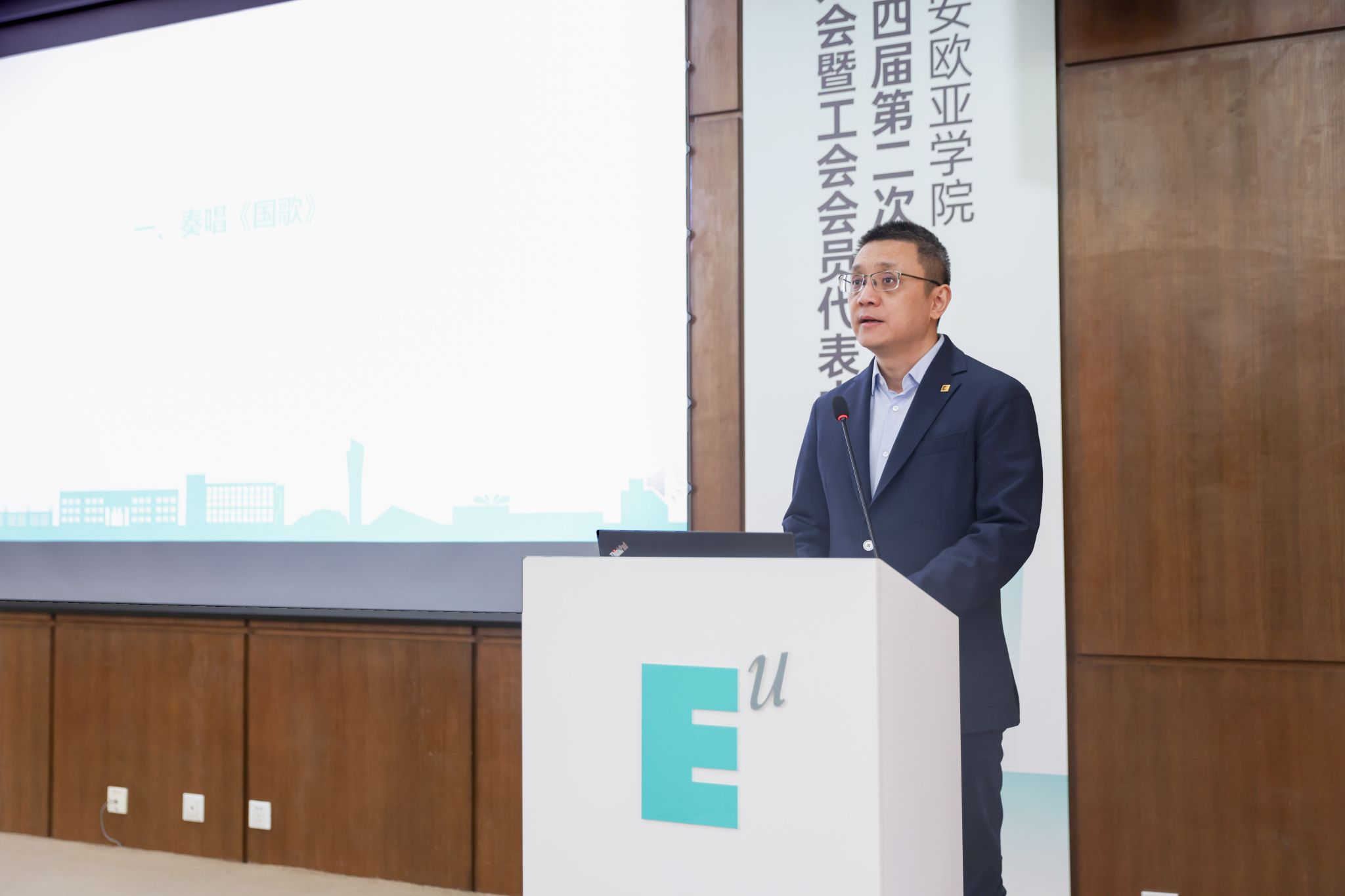 大会在雄浑激昂的国歌声中正式拉开帷幕,全体与会人员庄严肃立,高唱国歌。党委副书记、纪委书记王志强代表学校董事会、行政致辞。对过去一年里全体教职工在教育部教育教学审核评估等工作中付出的努力,王志强在致辞中给予了感谢,并对学校工会取得的成绩表示了肯定。