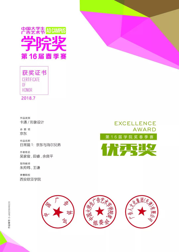 2018年7月,吴佳俊、余良平 、田睿“京东宠物狗微信表情”参加大广节学院奖春季赛获得优秀奖;