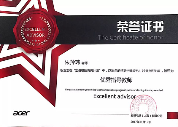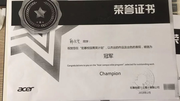 2017年12月,韩佳文等十人作品“小怪兽过关—轻、薄”参加全国“宏基校园精英计划”大赛获得金奖;