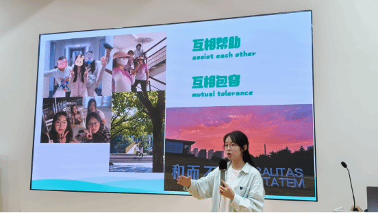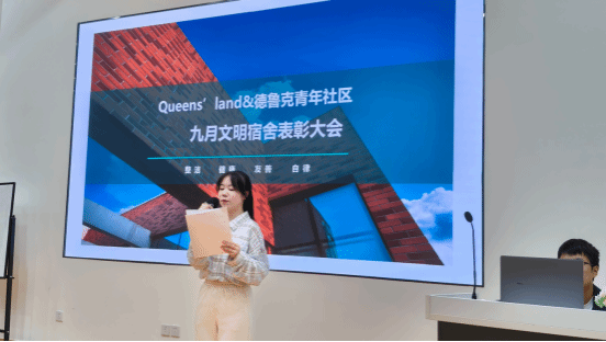宿舍作为承载日常生活的一席空间,既装载生活的平淡与喜乐,又让梦想生长绽放。青年社区共享价值观的践行更是为文明宿舍创建及塑造学生良好行为习惯提供了行动方案。大会第四项,文明宿舍代表Queens’land青年社区W2#513白文婧同学发言。白文婧同学结合整洁、健康、友善、自律的价值理念,分享了她们宿舍践行的小故事,引发了全场师生们的共鸣。在分享结束时,她强调到舍友应相互帮助,相互包容,才能收获友善的宿舍氛围。
