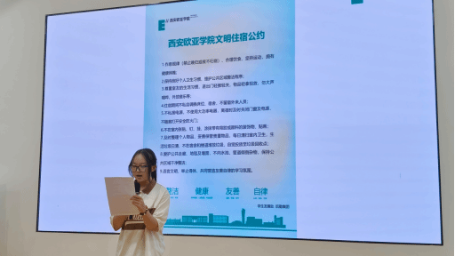 著名管理学家彼得·德鲁克曾说过:“我的目标就是要建设一个人性化的环境,让人们都能昂首挺胸的生活”。欧亚为青年社区定制了专属社区共享价值观“整洁、健康、友善、自律”。在宿舍,整洁友善的宿舍氛围,健康自律的生活习惯,需要同学们共同守护。大会第一项,社区主管助理王雪辰老师为学生带来精彩且详尽的文明宿舍卫生标准培训。王老师从宿舍的床铺、桌面、柜子、地面等八个方面详细讲解了整洁干净的标准,使在场的同学对卫生标准有了更加深入的理解。同时他与现场同学进行互动,了解学生对于培训结果的反馈。