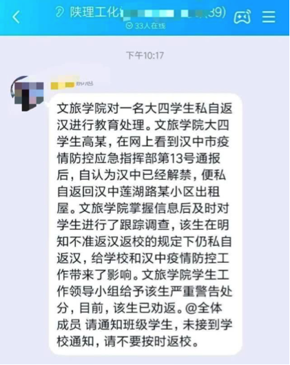 然而,无独有偶,上一事件的热度刚过没多久,便又有人“顶风作案”。2月25日,陕西理工大学的一名大四学生,因为在网上看到了汉中市疫情防控应急指挥部第13号通报文件后,自认为汉中已经解禁,便私自返回汉中市某小区的出租屋里。最终被学校给予了严重警告处分。