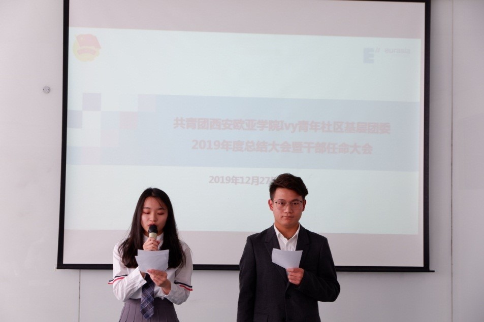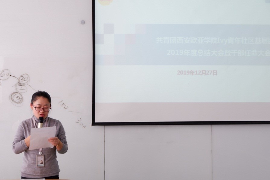 2019年12月27日,Ivy青年社区基层团委在教学楼南区A座301隆重召开2019年度总结大会暨干部任命大会。校团委书记董杨老师、第四青年社区分党委书记李嘉瑜老师、Ivy青年社区主管助理田甜老师、Ivy青年社区基层团委书记姚新颖老师、Ivy青年社区辅导员李停老师,以及Ivy青年社区基层团委全体干事共50余人出席了此次会议。