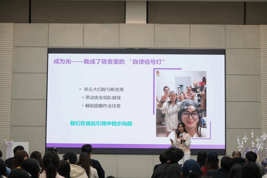 白文婧同学作为舍长代表,分享了她与室友们同心协力打造和谐宿舍的故事。她以身作则,主动带领舍友健身,引领大家养成健康的生活方式;同时以细腻的同理心经营宿舍日常,依据课表动态调整卫生分工,用耐心沟通消解日常矛盾,让每个人都能在舒适的节奏里承担责任。在她的带动下,这间方寸的小屋不再只是仅供休憩的物理空间,更成了能承接挑战、分享喜悦、托举彼此成长的精神港湾。这份“于细微处见用心”的经营,恰恰正是整洁、健康、友善、自律的青年社区共享价值最真实的体现。