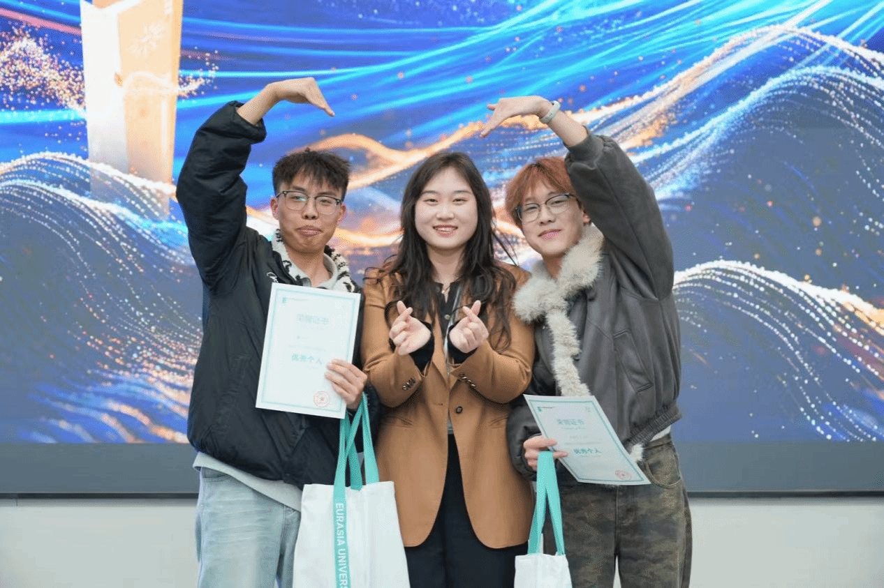 在表彰典礼上,主持人通过表彰前预热活动的照片选出年度最受欢迎的老师-徐源迎老师。这份荣誉是同学们对她真心付出的肯定。徐老师分享了自己从欧亚学生到辅导员的十年历程,身份虽变,但育人初心未改,她始终愿做学生成长路上的那束光。