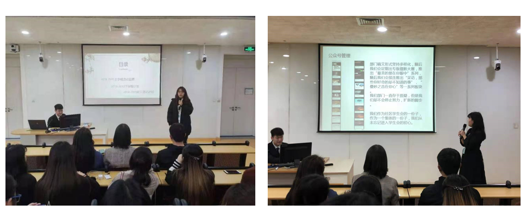宣传部由大一干事王思怡同学作出述职工作。公众号将会陆续推出“最美的景在你眼中”,“采访,那些你好奇却不知道的事”,“曼妙之音在你心”等模块。有什么想法建议就到公众号留言呐!