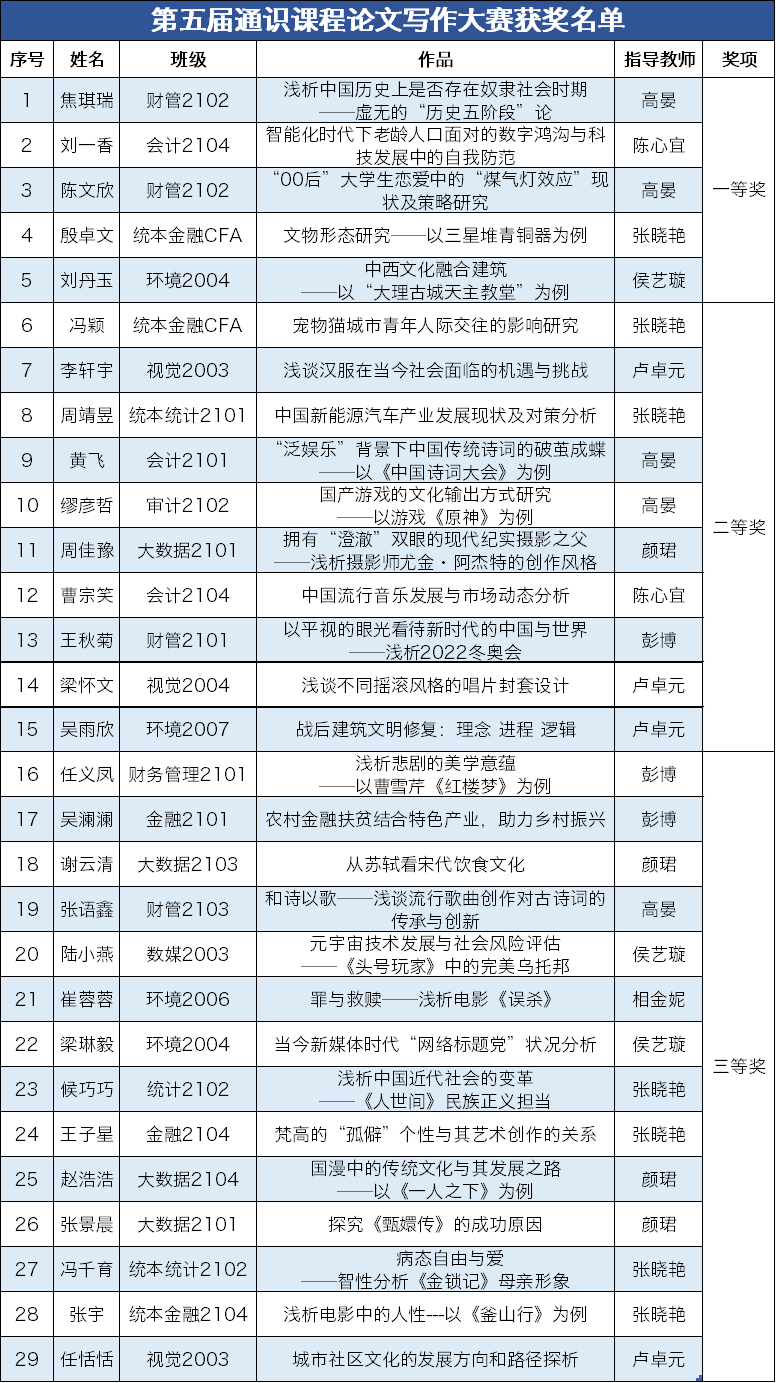 7月12日,KY开元集团官网入口第五届通识课程论文大赛圆满落幕,经过持续一个学期的初赛、复赛和决赛三轮评比,29名同学的作品在2800余份作品中脱颖而出,分获一、二、三等奖。获奖名单如下: