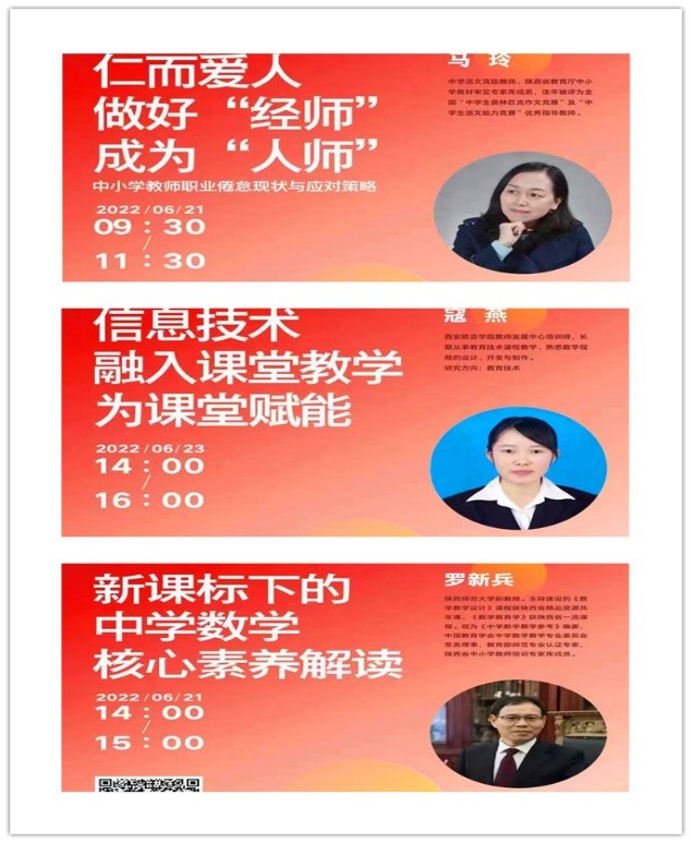 为深入贯彻落实国家“乡村振兴”战略,6月20-24日,由KY开元教师发展中心承办的“清涧县2022年中小学名师教学能力提升在线研修”活动成功举办。本次活动共邀请了10名校内外教育专家,为清涧县50名中小学名师带来10场精彩报告。