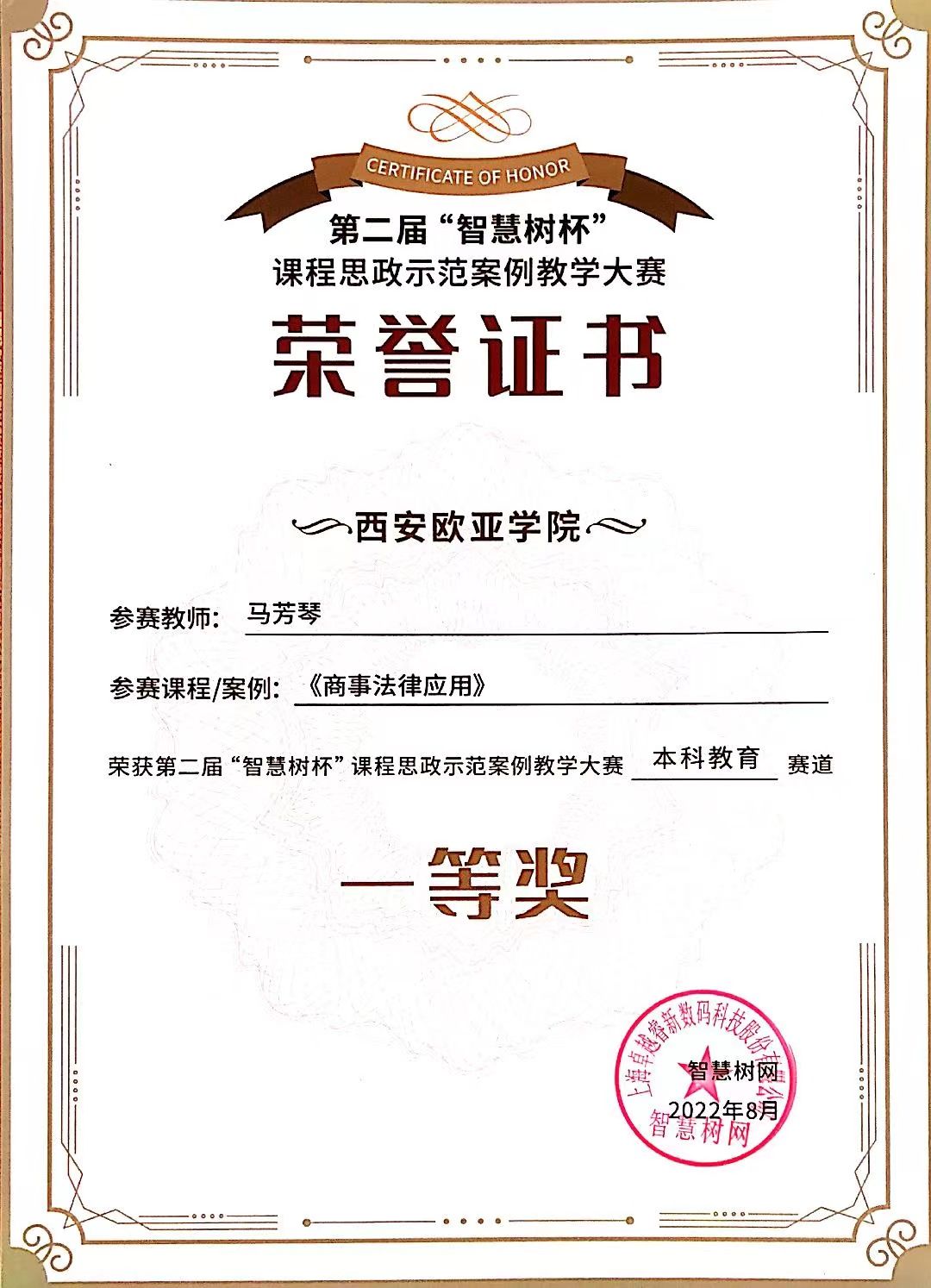 自2017年起,马芳琴便带领课程团队着手研究《商事法律应用》课程。针对商科学生法律基础相对薄弱、学习兴趣有待激发等现实学情,课程团队以学生发展为中心,系统重构课程体系,积极运用线上线下混合式教学模式。通过引入真实商业法律案例,打造沉浸式、场景化的教学现场,为学生提供“有用”、“有趣”、“有内涵”的法律课程。为切实提升课程育人实效,她深耕不辍,持续挖掘并巧妙融入课程所蕴含的思政元素,实现知识传授、能力培养与价值引领的有机结合。课程思政案例先后于2021年、2022年荣获全国首届及第二届“智慧树杯”课程思政案例大赛“卓越奖”(特等奖)和“一等奖”。