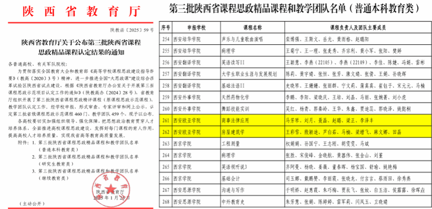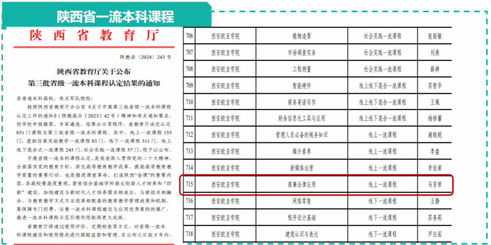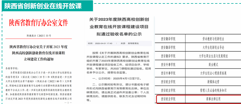 在教学设计、思政融合与资源建设等方面多年坚持不懈的探索与实践下,该课程团队所编写《商事法律应用》课程于2024年获评“陕西省一流课程”、2025年获评 “陕西省课程思政精品课”,并顺利通过了“陕西省创新创业在线开放课”的验收。