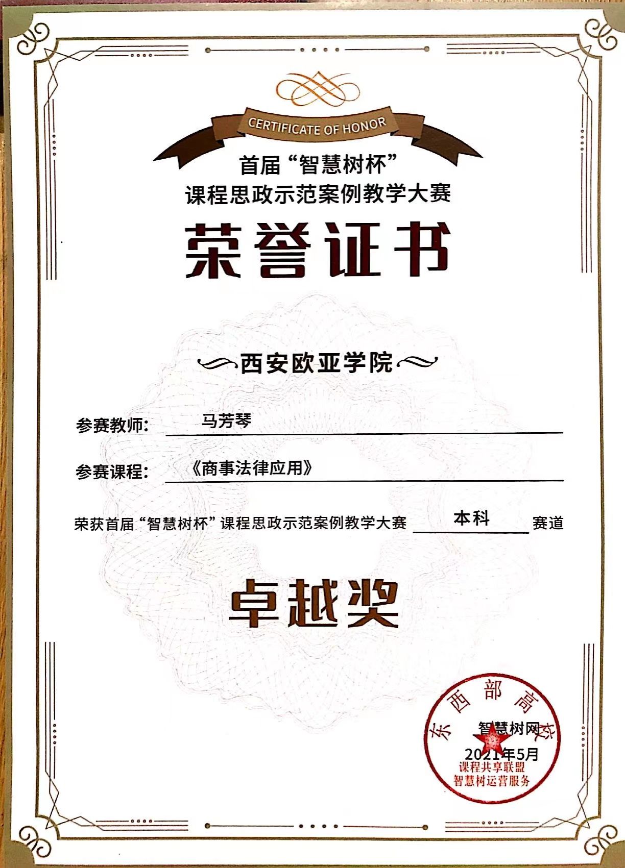 第二届“智慧树杯”课程思政案例大赛荣誉证书